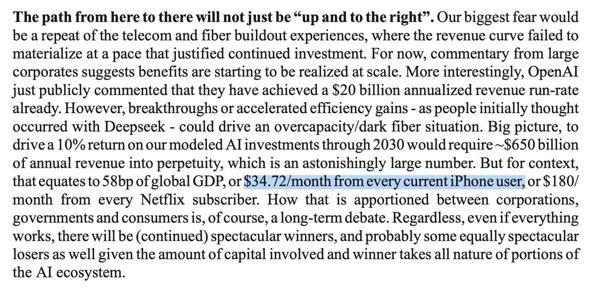 The valuations are wild. The return profile is shaky. China is conquering the renewable age. JP Morgan pointed out in a note recently that every iPhone user would have to pay $34 a month to drive a 10% return on all the various AI investment deployed.