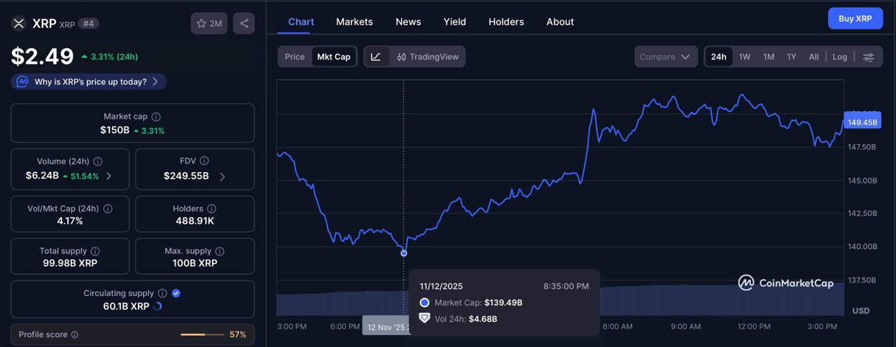 XRP staged a sharp V-shaped recovery after dipping to a $139.49 billion market cap on 12 November, signaling that buyers viewed the pullback as a liquidity sweep rather than a reversal.