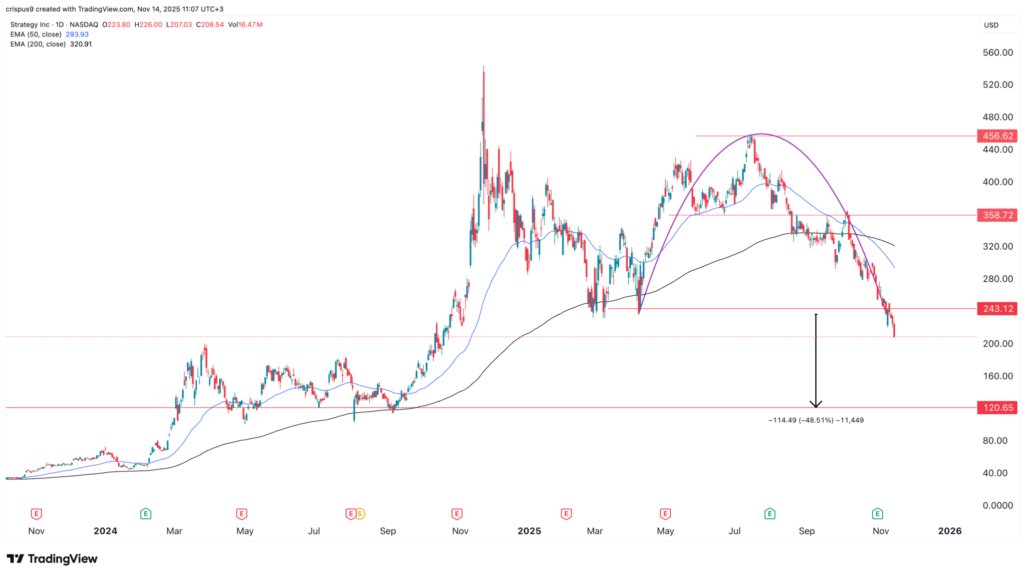 Strategy stock price continued its strong downward trend this month and is now hovering at its lowest level since October last year. It has plunged by 61% from its all-time high, even as the S&P 500 and Nasdaq 100 indices have jumped to their all-time highs.