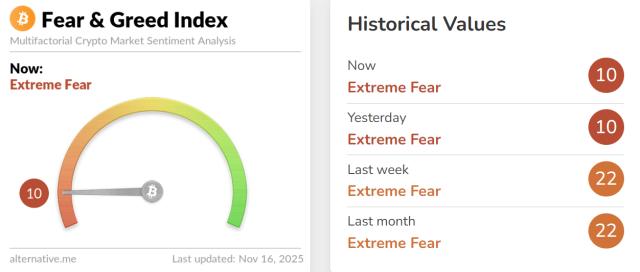 The Fear & Greed Index at 10 reflects extreme fear comparable to early 2022 and June 2022, both confirmed bear-market phases.