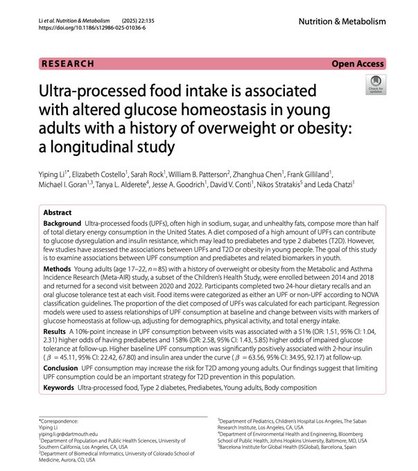 Consuming even modest amounts of ultra-processed foods can dramatically increase diabetes risk in young adults. A recent study found that just a 10% increase in ultra-processed food consumption among young adults (ages 18–22) led to over a 60% higher risk of developing prediabetes within four years. These findings reinforce existing evidence that ultra-processed foods consistently promote overeating (~500 extra calories/day), contributing directly to obesity and metabolic dysfunction. Early adulthood is a crucial period when dietary patterns solidify into lifelong habits. Educating young adults about the substantial health risks posed by ultra-processed foods and empowering them to prioritize whole, minimally processed options is crucial. Such early dietary intervention can profoundly reduce future risk of diabetes and significantly impact the trajectory of the obesity epidemic and broader metabolic health crisis.