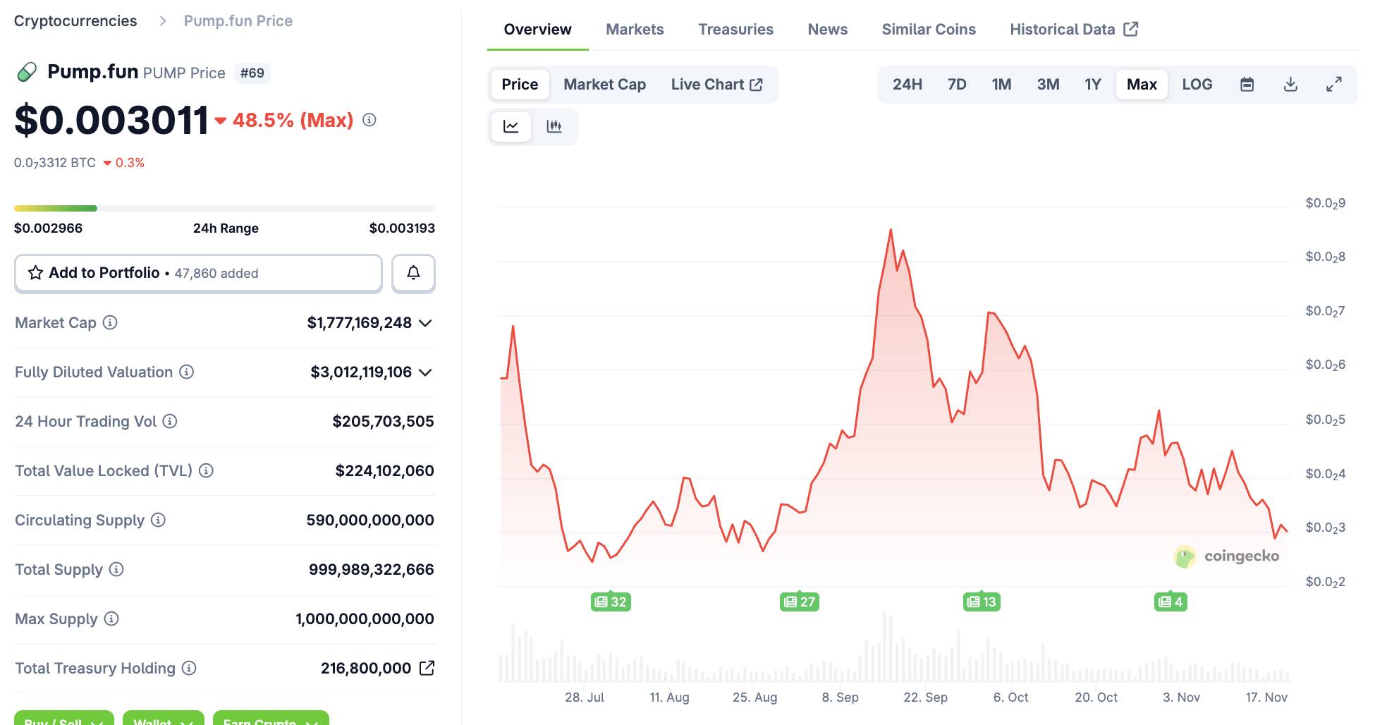 - As a result, pump.fun's PUMP Token buyback program, which is deducted from revenue, has also been affected, significantly affecting the Token price. According to CoinGecko data, the price of PUMP is fluctuating around $0.003, down more than 48% since the Token launch.