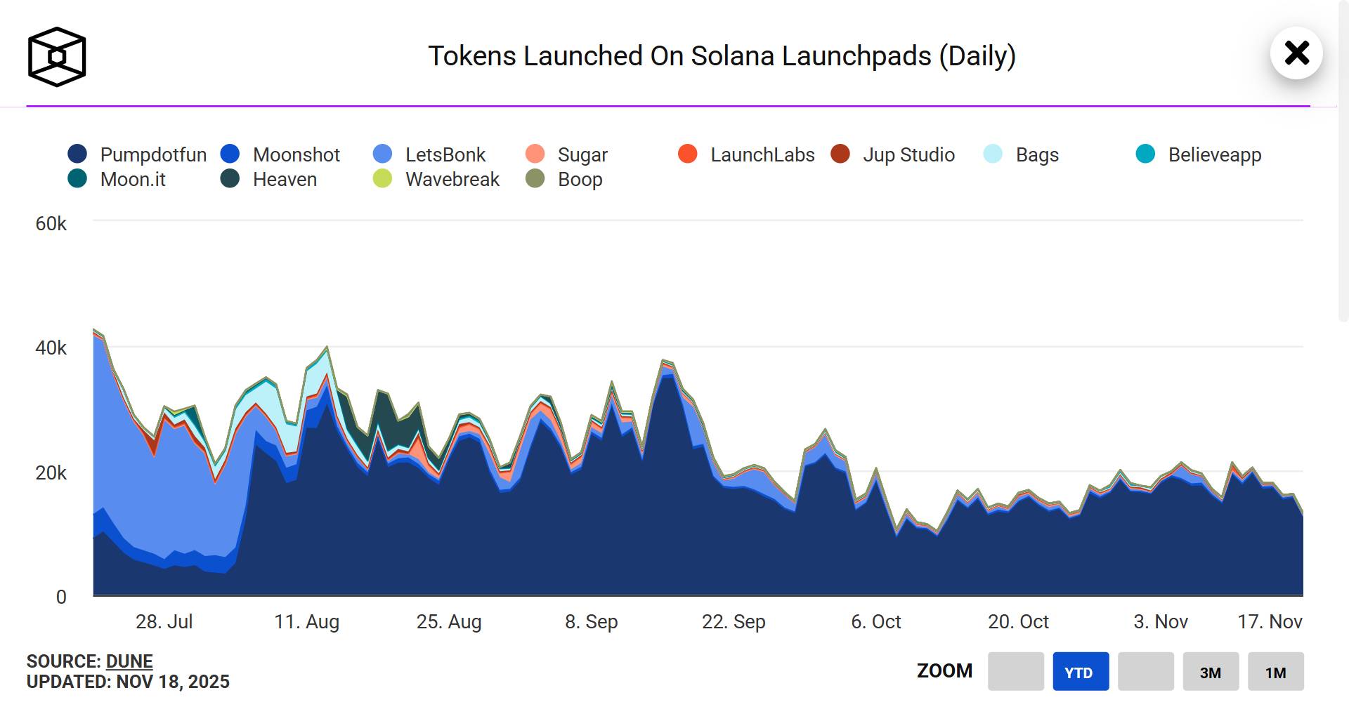 Statistics on the number of Token launched on Solana Launchpads. Source: The Block (November 19, 2025)