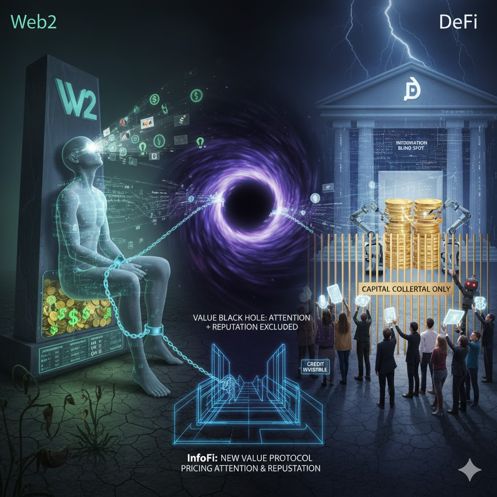 Today, contemporary digital civilization faces two core dilemmas: on the one hand, there is the "digital exploitation" of Web2, a trillion-dollar attention economy whose fuel is provided free of charge by 99% of "digital tenants," while its value is ruthlessly captured by 1% of platform operators; on the other hand, there is the "capital wall" of DeFi, a revolution aimed at "financial inclusion" that excludes billions of "credit-invisible" individuals worldwide due to its systemic reliance on "over-collateralization."