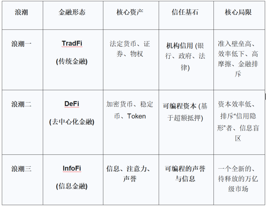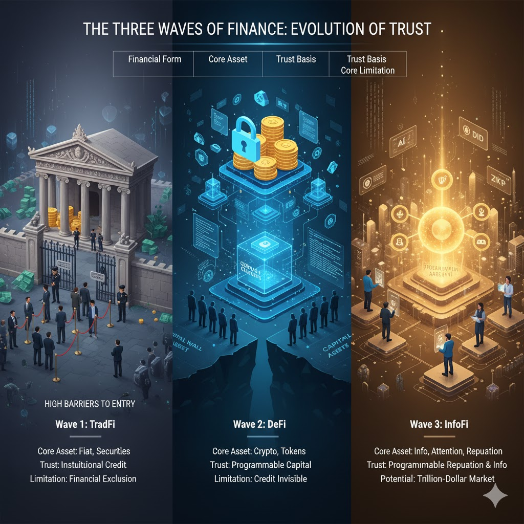 Looking back at the evolution of finance is looking at the evolution of "trust." From TradeFi to DeFi, and then to InfoFi, these represent three great leaps in the cornerstone of trust.