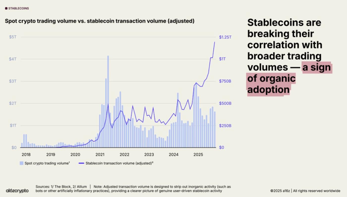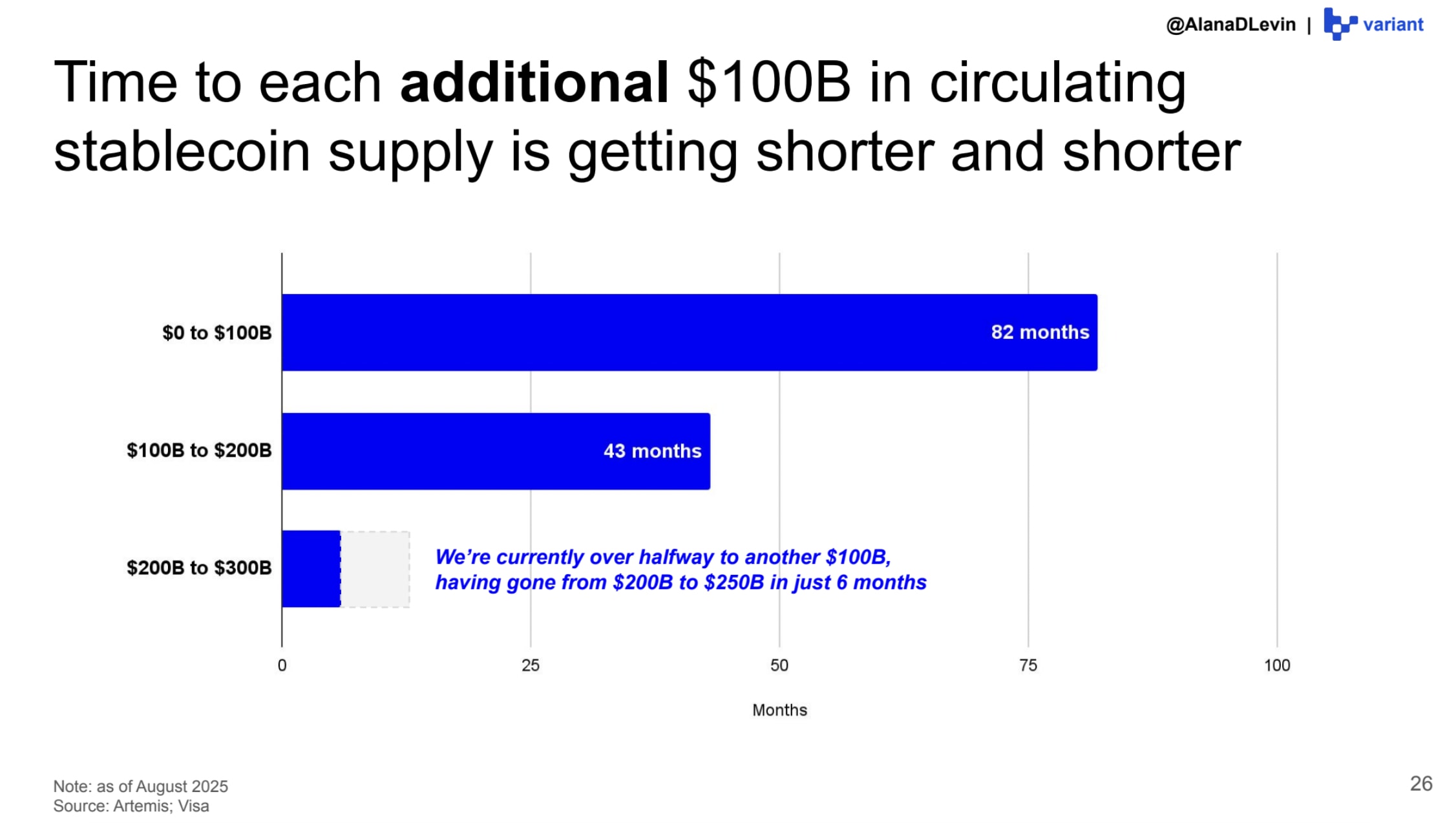 In this post I’ll try to avoid all of the basic or mundane stablecoin facts you more than likely already know, and present a case for what the future of stablecoins looks like beyond just extrapolating total supply growth - because that’s boring! I say that it’s boring because anyone can point to the supply chart and come to the conclusion that clearly these digital representations of US dollars are quite a hit, and reasonably assume the chart will continue rapidly trending up and to the right. Alana Levin of Variant also did the work for us with this chart from her recent 2025 crypto trends report, which I highly recommend checking out: