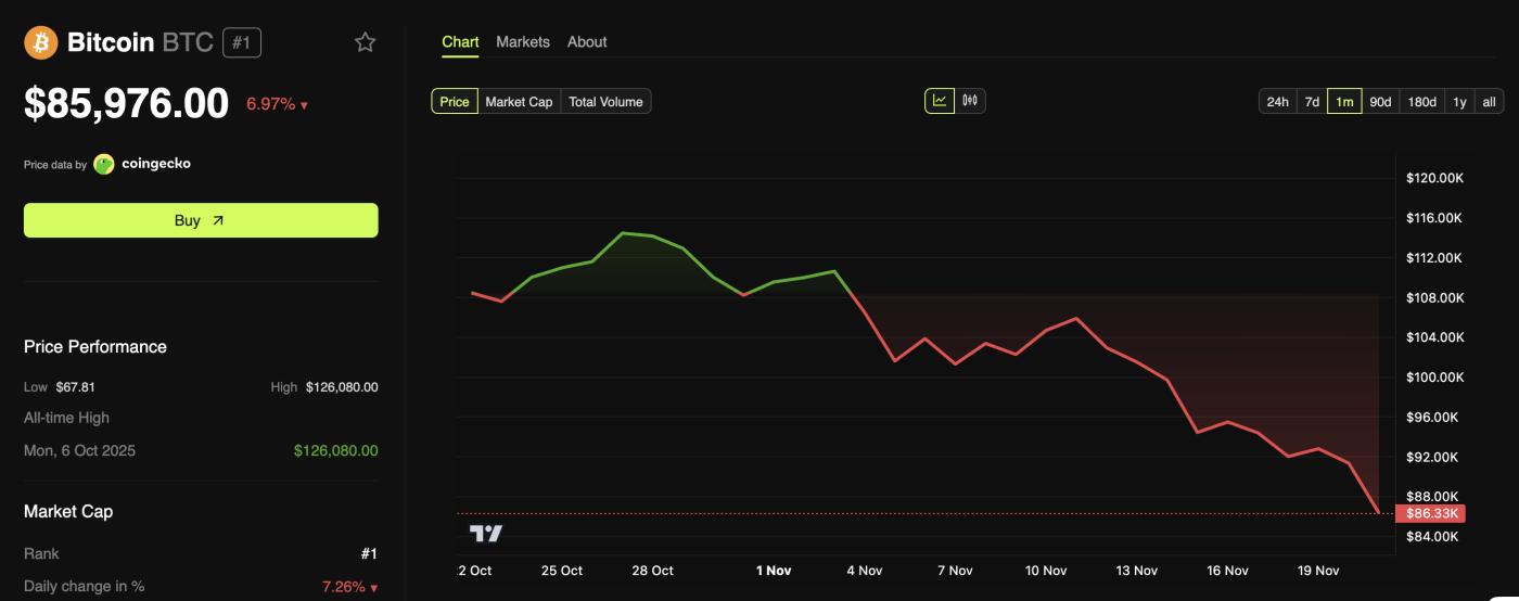 The decline deepened today, with the price dropping to $85,281 in early Asian trading hours. At the time of writing, Bitcoin is trading at $85,976, down 6.97% over the past 24 hours.