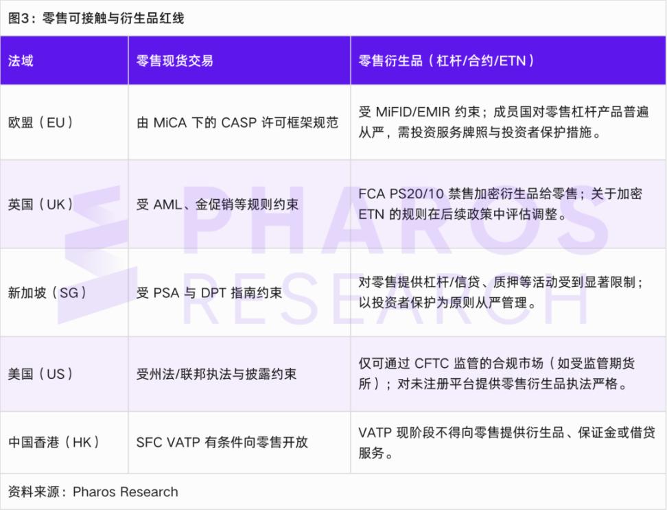 Asian countries exhibit drastically different approaches to regulating crypto derivatives. Japan revised its Financial Instruments and Exchange Act in 2019, including crypto asset derivatives in the category of financial instruments and imposing registration regulations on businesses engaged in crypto spread/futures trading. Japanese exchanges can offer crypto margin trading to clients, but Japanese self-regulatory rules have significantly reduced the maximum leverage ratio from 25:1 to 2:1. Therefore, Japanese users can still trade low-leverage Bitcoin contracts, but the market size is limited. South Korea, on the other hand, simply prohibits its exchanges from offering any form of crypto futures or options, deeming the risk too high for retail investors. South Korean investors can only trade through overseas platforms, but the South Korean government has strengthened its monitoring in recent years, requiring banks to restrict remittances to overseas crypto derivatives platforms. When Hong Kong introduced its licensing system in 2023, it explicitly prohibited offering crypto derivatives trading to retail investors, allowing only spot trading of the underlying assets; professional investors' participation in derivatives through Hong Kong platforms is also strictly limited. Hong Kong only allows asset management companies approved by the Securities and Futures Commission (SFC) to issue structured products or ETFs linked to cryptocurrencies for trading in regulated markets (such as crypto asset futures ETFs listed on the Hong Kong Stock Exchange, open to the public). Singapore's Monetary Authority (MAS) takes a cautious approach to derivatives. In 2019, it approved the listing of Bitcoin and Ethereum swap contracts on the Singapore Exchange (SGX), but stipulated that retail investors could not participate directly, opening the market only to institutional and professional investors. Furthermore, in its enhanced investor protection guidelines in 2022, the MAS restricted retail access to high-risk crypto products, including derivatives, and required local service providers not to easily promote any crypto trading services to the public through ATMs or advertisements. Overall, most major Asian markets restrict retail access to crypto derivatives: Japan allows it but with strict regulations and low leverage; Hong Kong, Singapore, and South Korea almost completely prohibit retail participation, opening limited channels only to institutions/professionals. This contrasts with the openness of some Western markets.