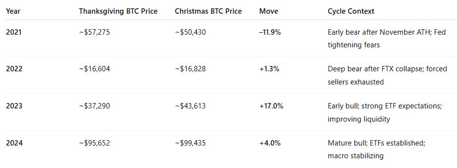 Bitcoin's Performance Between Thanksgiving and Christmas (2021–2024)This year, the pattern repeated a familiar element: the November drop came early, and by Thanksgiving, the selling momentum had eased slightly.