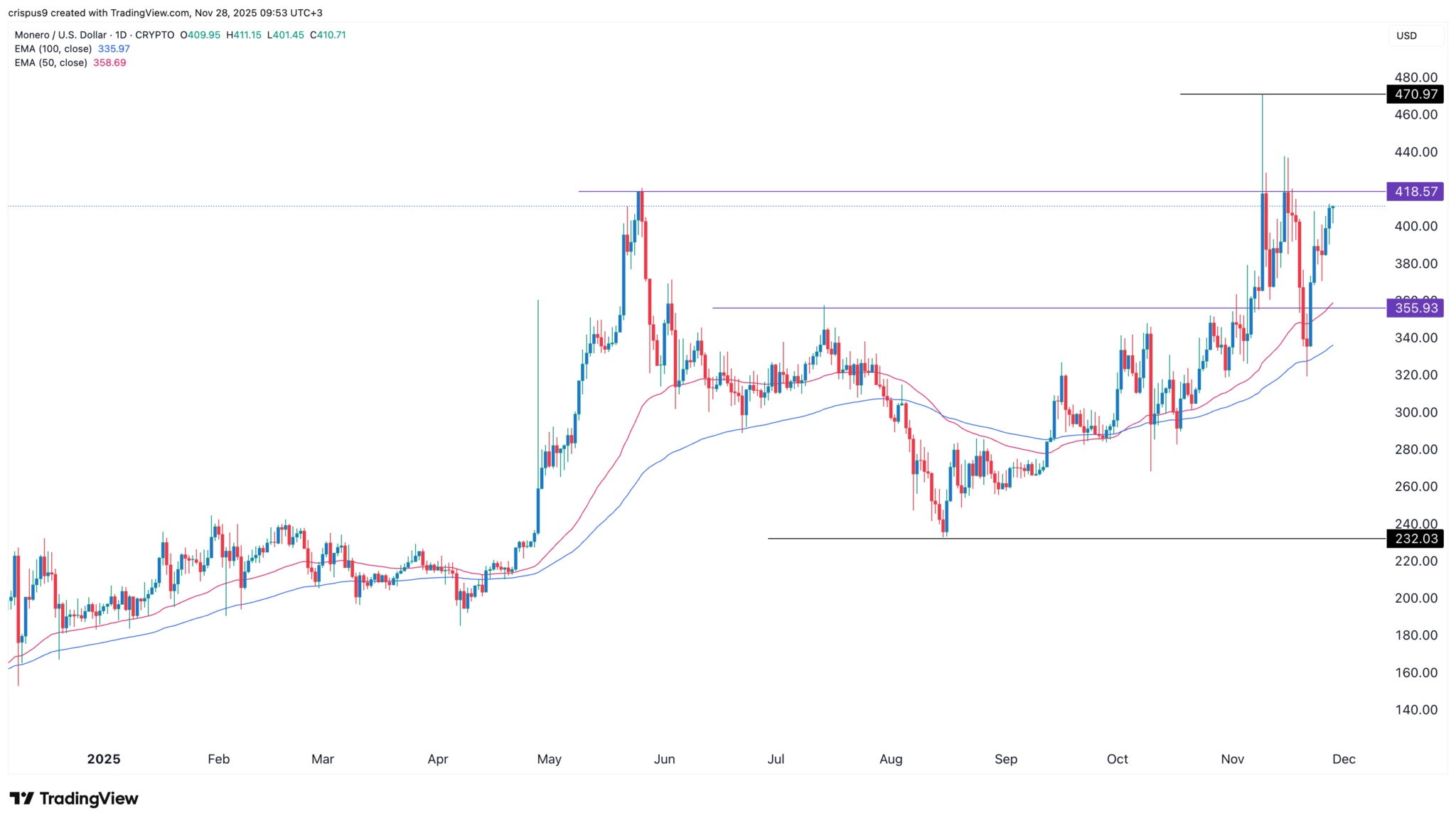 The XMR price jumped from a low of $232 in August to the current $410. This rally continued this week after Grayscale announced that it would transition its trust for institutional investors into an ETF available to all investors.
