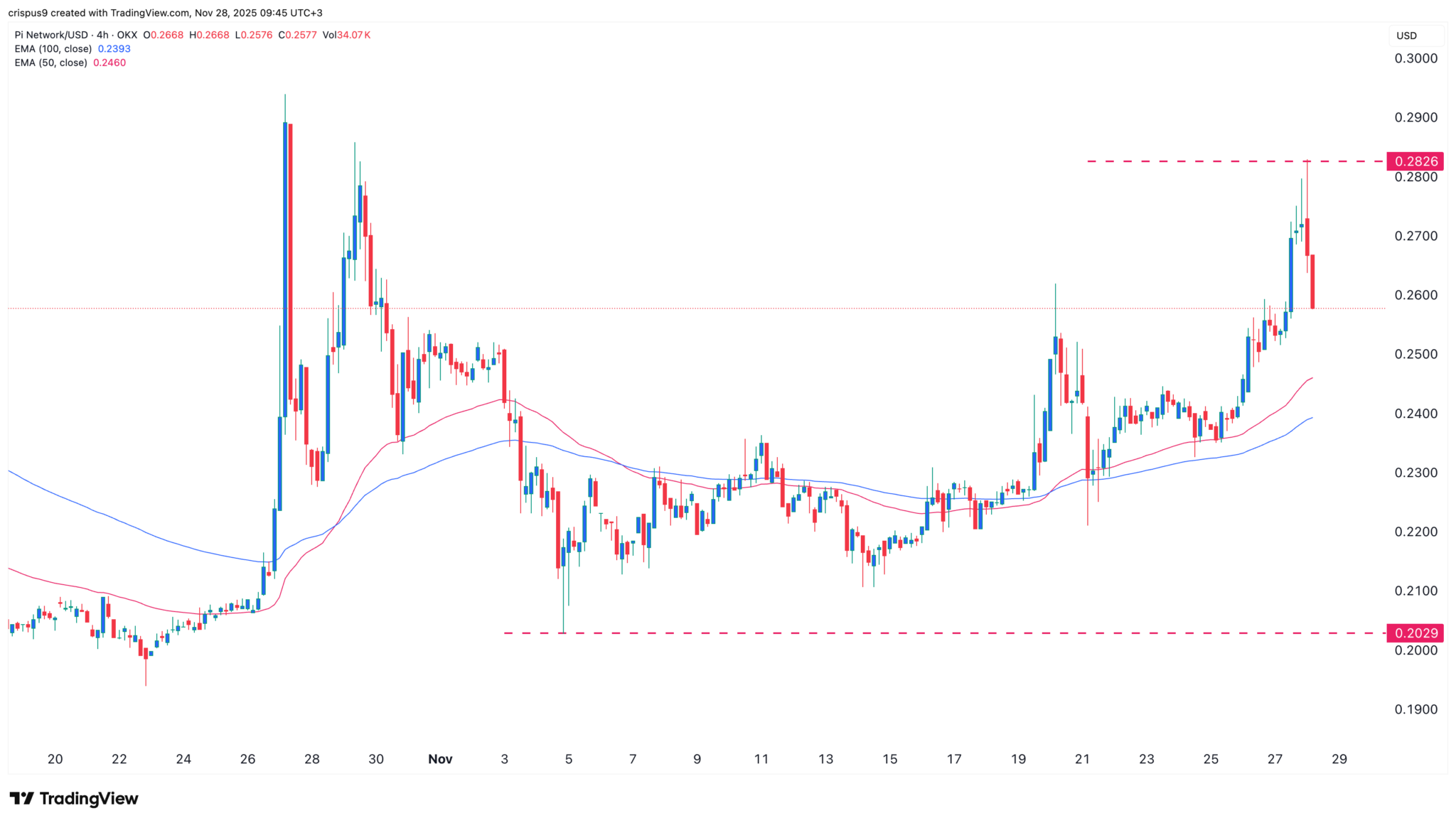 The four-hour chart shows that the Pi Network price has been in an uptrend in the past few weeks, moving from $0.2022 earlier this month to a high of $0.2826.