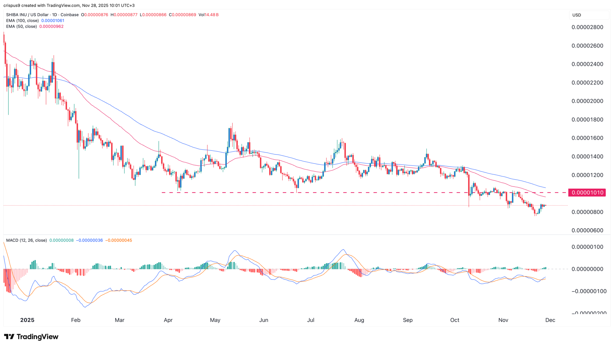 Shiba Inu price has now moved below the lower side of the triangle pattern at $0.00001010. It has also moved below the 50-day Exponential Moving Average, while the MACD indicator has moved below the zero line.
