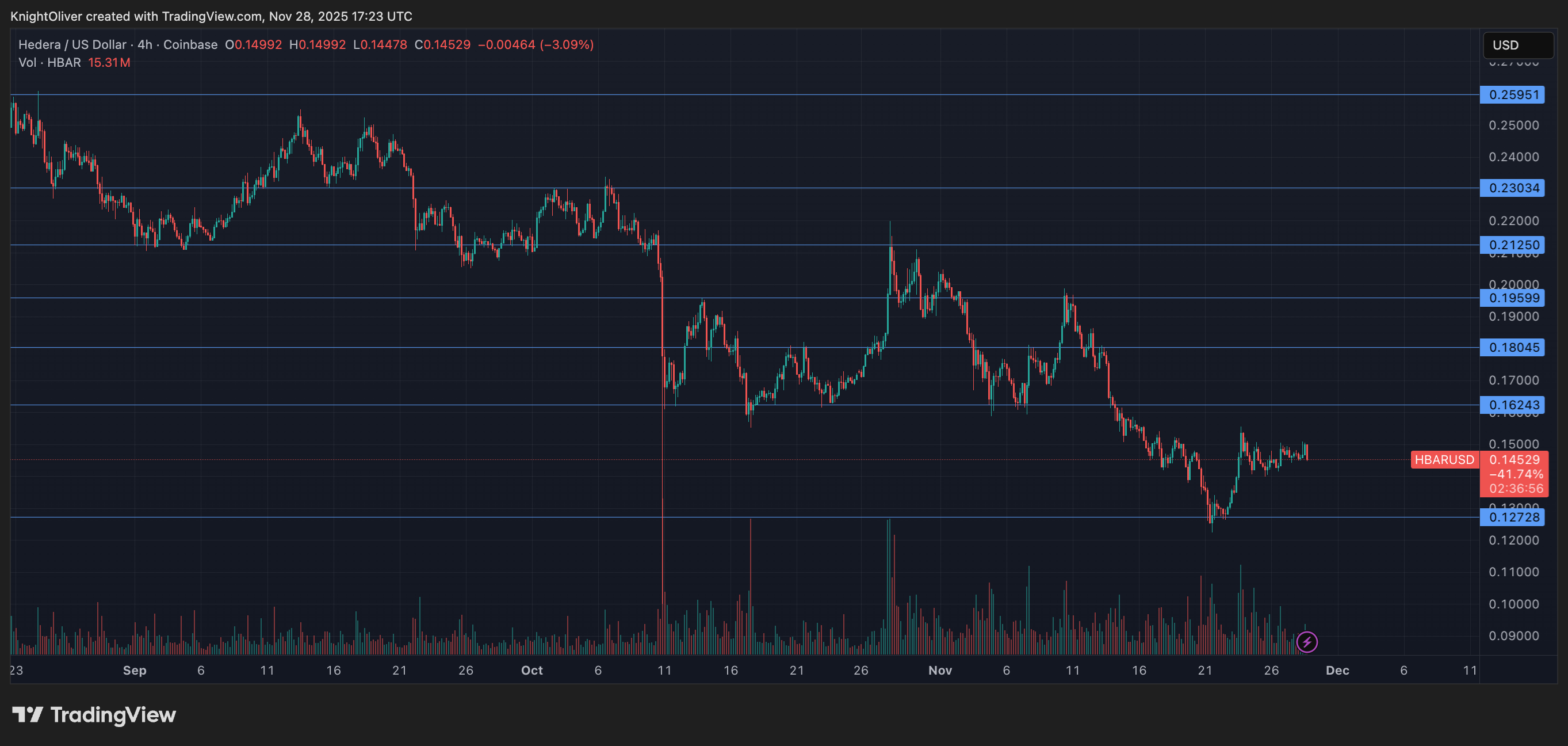 HBAR surged on Thursday, jumping from $0.1457 to $0.1494 as institutional flows accelerated and volume spiked 96% above its 24-hour average. The breakout gained traction around 08:00 GMT, with steady higher lows forming across a $0.0054 range and delivering a 3.5% intraday gain.