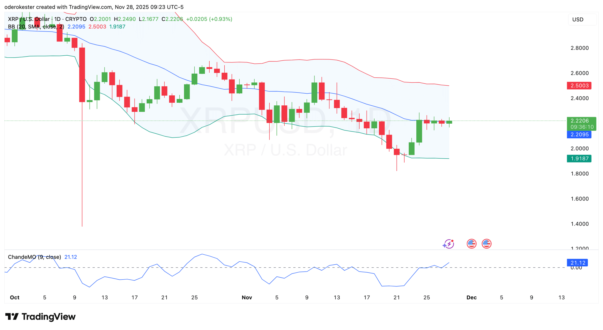 On the daily XRP/USD chart, price is trying to stabilize after a persistent November downtrend. XRP is currently trading around $2.22, just above the 20-day Bollinger Band midpoint at $2.21. That means bulls have managed to reclaim the mean after briefly pushing price down to the lower band near $1.92, which now acts as key short-term support.