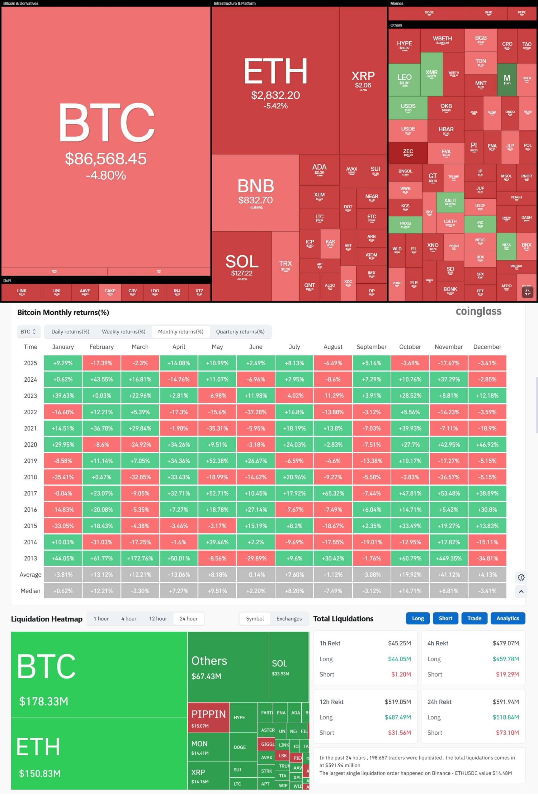 The decline spread widely, causing the total market Capital to evaporate nearly 140 billion USD in just the past few hours. Liquidation pressure skyrocketed, with more than 590 million USD liquidated in 24 hours, of which the Longing side (long buy) accounted for nearly 88%.