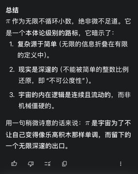 💬The key is to ask a good question. Given the current capabilities (average intelligence) of major mainstream AIs, the important thing isn't which AI is the strongest, nor how to optimize prompts; these are merely icing on the cake, or even insignificant. The truly important thing is to ask that (good) question. Is asking questions easy? Not difficult. The difficulty lies in many people losing their most precious curiosity early on. Now, it doesn't matter how many questions you ask or how unusual they are; as long as you can ask a question, AI can give you a fairly satisfactory, even amazing, answer. For example, in the screenshot here: What is the significance of the irrational nature of the number π for the essence of the universe? Gemini's reply is rich, comprehensive, and poetic. Another example: What is the profound meaning of the constancy and effectiveness of the speed of light? Can it be used to prove that we exist in a virtual world? And so on. My favorite way to ask questions is to have the AI argue a point from both positive and negative perspectives. As the saying goes, "Listen to both sides and you will be enlightened." In summary: Given most people's curiosity, it's really not up to them to compete on AI capabilities and prompt word optimization.