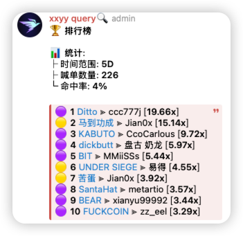 Our new multi-chain query bot works really well, I recommend it 👉t.me/xxyy_query_bot It supports four chains: Solana, BSC, Base, and ETH. It allows for quick jumps to transactions and rapid viewing of the group's shill leaderboard. It also generates profit charts based on contracts, which is quite impressive. The market has been doing well lately; at least 10 projects in the group have contracts offering 3x or higher returns.