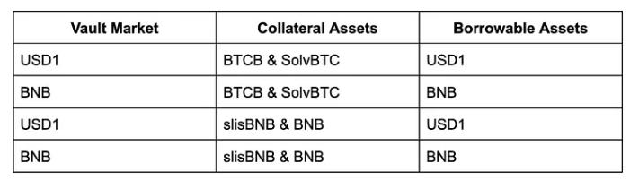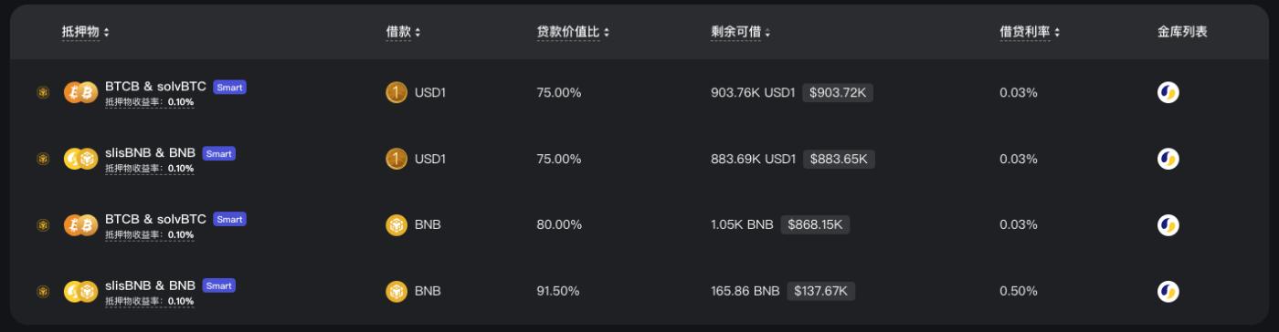 Lista's smart lending currently supports borrowing USD1 and BNB using BTCB, SolvBTC, slisBNB, and BNB as collateral. There are a total of 4 vaults, where users can deposit at a fixed ratio or customize any ratio, and the same applies to redemption.