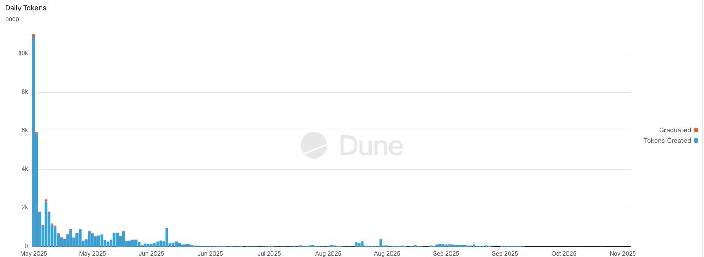 When boop.fun launched on May 1st, the platform saw 10,877 Meme tokens created in a single day, surpassing pump.fun. However, its performance has declined ever since. According to Dune data, while boop.fun hasn't "collapsed," it has only launched one Meme token in the past 24 hours. The market capitalization of the BOOP token has now fallen to $8 million.
