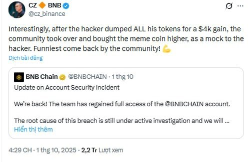 My WeChat account, which I don't use often, was hacked early this morning. Some users who saw my posts and messages blindly bought this meme coin based on their trust in me, resulting in losses. I feel extremely distressed. Therefore, I will personally allocate some BNB for an airdrop to users who absolutely lost money trading this meme coin using Binance's no-private-key wallet and Alpha platform during the time my WeChat account was hacked. The airdrop will be distributed within 24 hours.