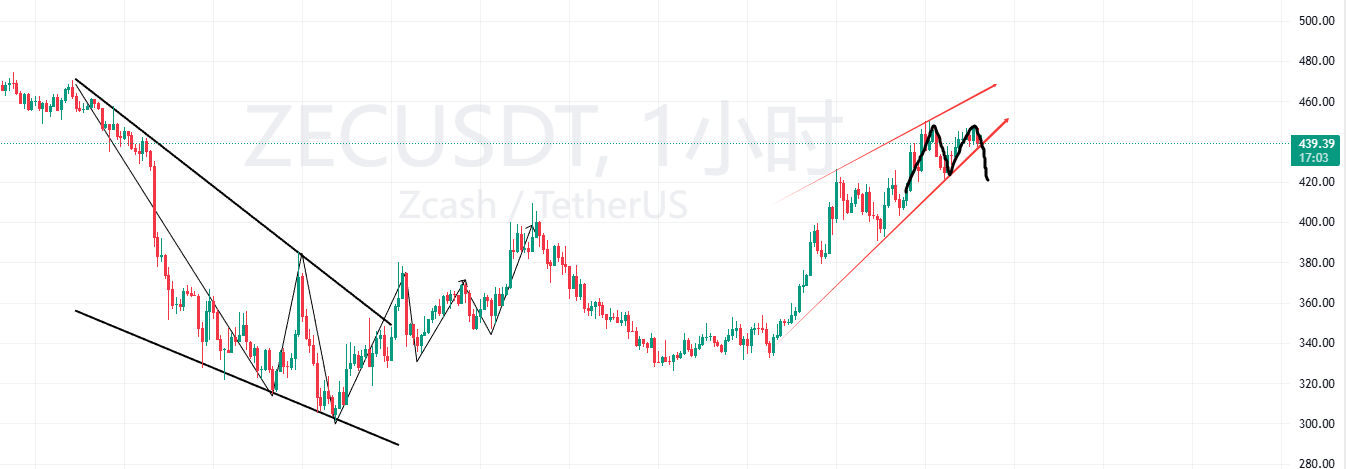 Follow-up: It's time to take profits on your ZEC long positions! The 1-hour chart looks off; there's a rising wedge, a double top, and a bearish divergence. A short-term pullback is highly likely, so don't give back your profits. We bought at 359, and it's now up to 440—we've made enough profit already. Don't be greedy and chase the last bit of gains; it's more reliable to secure your profits first!