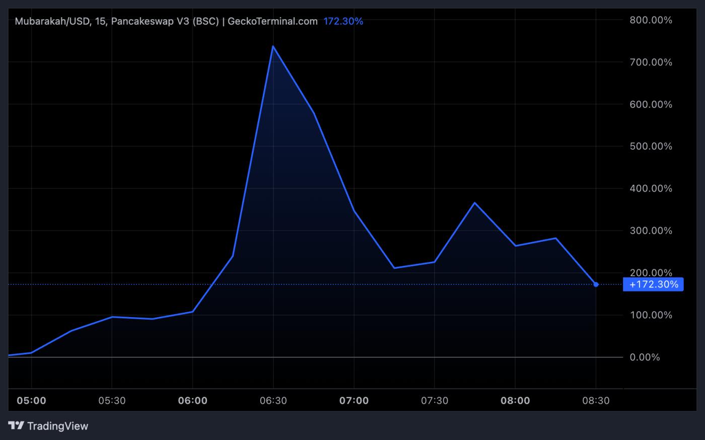 Following the appearance of a fake post from Yi He's account, the price of Mubarakah surged. According to data from Geckoterminal, the Token price peaked at $0.008 USD during this morning's Asian trading session, representing a nearly 200% increase and setting an all-time high for the Token .