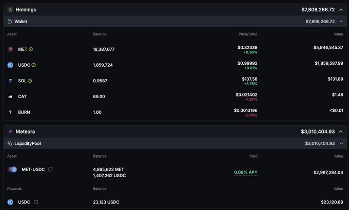 These tokens were bought back using a mix of open-market buys, providing liquidity on MET-USDC pools on Meteora, and through our market makers. $MET Tokens bought back: 23,025,030 USDC spent: 10,673,328 The wallet used for $MET Buybacks: FzULv8pR9Rd7cyVKjVkzmJ1eqEmgwDnzjYyNUcEJtoG9 Attached is a picture of the wallet’s main holdings.