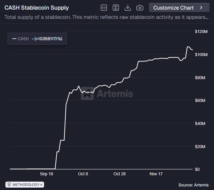 The native stablecoin of self-custody web3 wallet Phantom, Cash (CASH), recently surpassed the $100 million mark in supply, per data from Artemis, after debuting on Sept. 30.