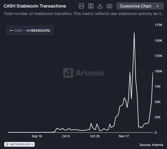 Taken together, those activations have resulted in the parabolic growth in the number of CASH transactions, which spiked to almost 162,000 on Nov. 25, per Artemis data.