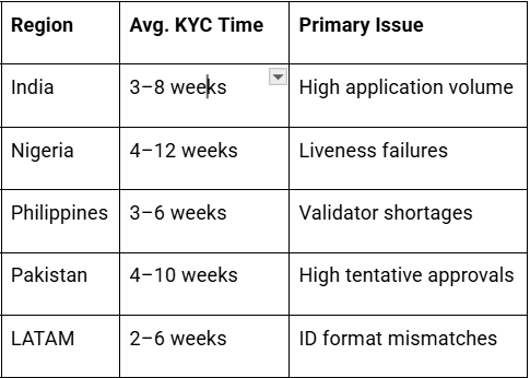 Based on community data collected from over 2,700 user reports, the slowest KYC regions in 2025 include: