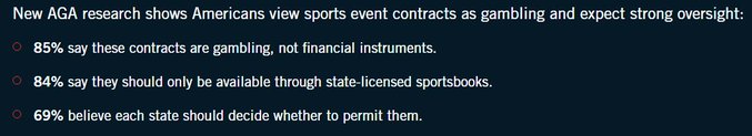 "New AGA research shows Americans view sports event contracts as gambling. 85% say these contracts are gambling, not financial instruments."