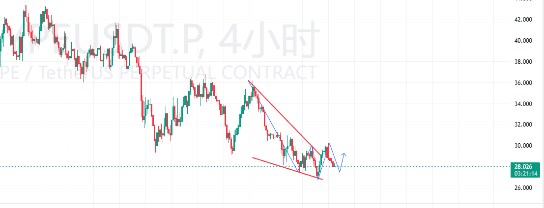 The key support level to watch is the 25-26 range. If it doesn't break below this level, based on the wedge pattern, the rebound could reach around 36U. Therefore, once it falls to near this support level, it's a good time to consider going long, as it offers good value.