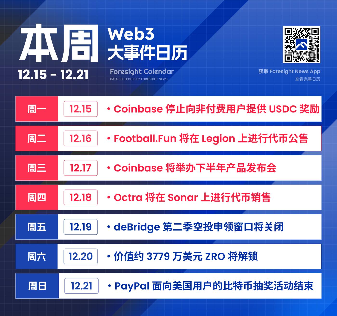 Monday (December 15): Coinbase will stop offering USDC rewards to non-paying users on December 15. Only Coinbase One Premium subscribers will be able to enjoy the 4% stablecoin yield.