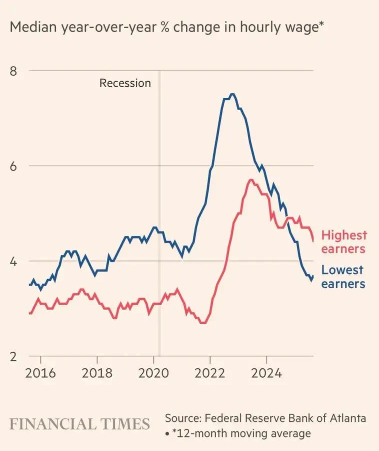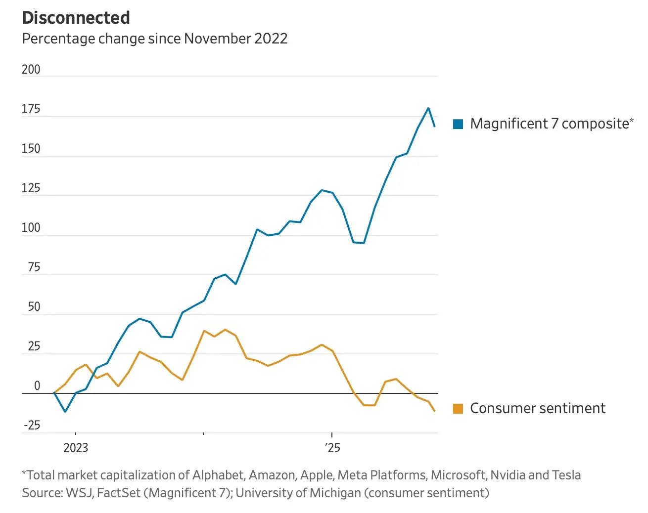 If we observe the decline in consumer sentiment, it (roughly speaking) fits the definition of a recession—it's prolonged, widespread, and sentiment levels are steadily approaching historic lows. Kevin Gordon of Schwab calls it "Vibepression"—extremely low sentiment, while GDP is propped up by investments related to artificial intelligence. Can an economy booming because of AI data center construction bring happiness to ordinary people? The answer is clearly no!