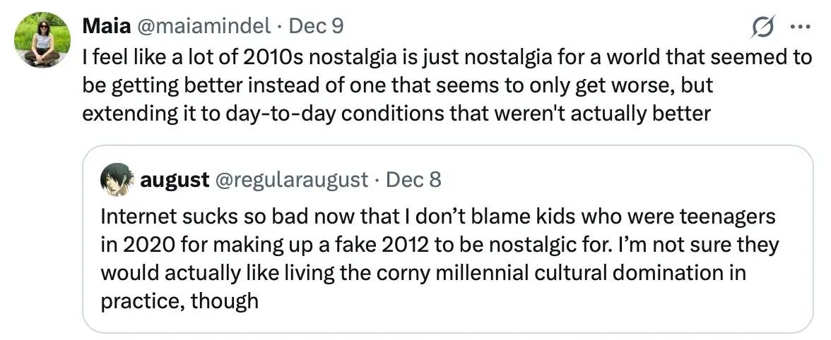 While the 2000s and 2010s had many problems (really many!), people's spirits didn't completely collapse. Today, there's even a nostalgiacore trend on TikTok, where teenagers are creating a beautiful fantasy of "2012"—a time of endless scarves, third-wave boutique coffee shops, and an era when Instagram was just for sharing photos of daisies in the fields, not the hyper-competitive, algorithm-driven battlefield it is today.
