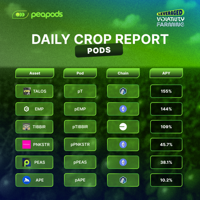 🧑‍🌾 Daily Crop Report (15/12/25) – Volatility Farming (Pods) Top Pods today: 🌱 155% – $TALOS (pT) on Arbitrum 🌱 144% – $EMP (pEMP) on Ethereum 🌱 109% – $TIBBIR (pTIBBIR) on Base 🌱 45.7% – $PNKSTR (pPNKSTR) on Ethereum 🌱 38.1% – $PEAS (pPEAS) on Ethereum 🌱 10.2% – $APE (pAPE) on Arbitrum The top 3 Pods are still pumping with triple-digit APYs. Whether the market trends up or down, volatility = opportunity for farmers. Farm volatility your way: ✅ Make any token an LST: Wrap to earn passive Pod yield ✅ LP 50/50 to earn full volatility yield from arbitrage ✅ Or LP single-sided using liquidation-resilient Soft Leverage for higher returns Start farming now: 🌐 peapods.finance 📣 Need help? Join the Telegram: t.me/PeapodsFinance 🧵 Why LP farming is better on Peapods: x.com/PeapodsFinance/status/19...