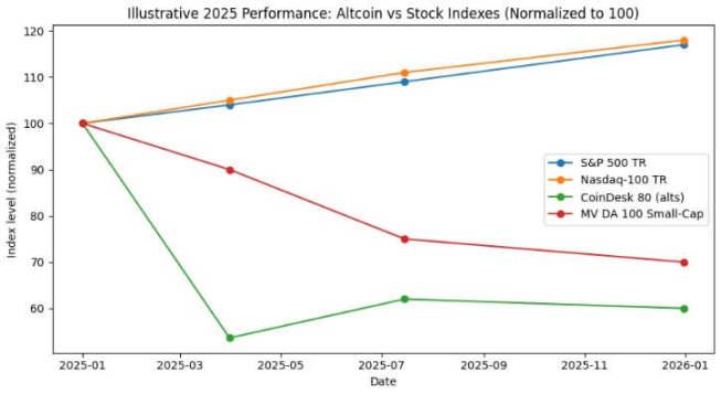 In 2025, the S&P 500 and Nasdaq 100 indices rose by approximately 17%, while the CoinDesk 80 Crypto Index fell by 40%, and small-cap cryptocurrencies fell by 30%.