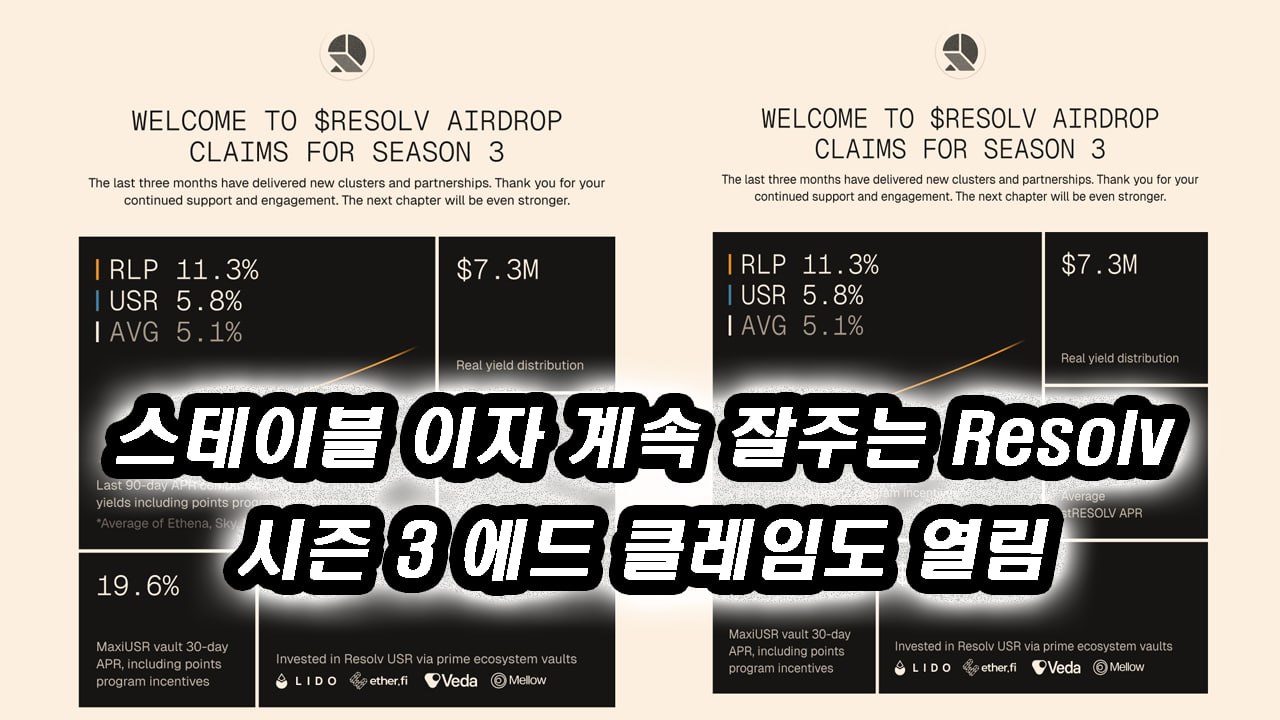 โช๏ธ Resolv Season 3 ed claim is now open. Please continue to earn interest. ๐ฑ Hyperliquid Ecosystem Dark Horse Resolv Airdrop A to Z Guide (Feat. Earning Stablecoin Interest) ๐ฑ (2025.11.28) Resolv USR Yield Maxi Vault, Consistently Providing 12-15% Interest Resolv, which previously offered an average interest rate of 11% for RLP and 6% for USR, Season 3 ed claim is now open. claim.resolv.xyz ๐ฑ Original Tweet I'm getting some Ed allowance because I can roll over the interest. If you consistently pay good interest, don't crash like other places, and just give me enough allowance, I'm satisfied, Resolve. If you raise the token price in the future, I'll be even happier ๐ญ๐ญ Your hearts and likes are a huge help to BQ content. ๐คฉ #RESOLV #RESOLV #Stablecoin