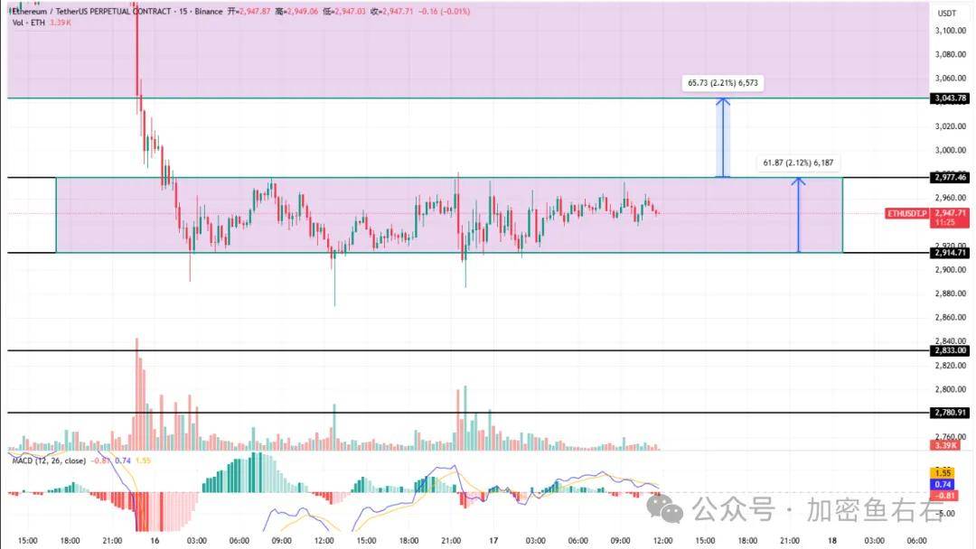 ETH closed with a bearish doji candlestick on the daily chart, clearly indicating a downtrend. The pattern is lower highs followed by lower lows, with the previous high at 3177. Approaching this level presents an opportunity. The lower Bollinger Band is gradually widening downwards, opening up further downside potential. The intraday strategy remains primarily shorting on rallies.