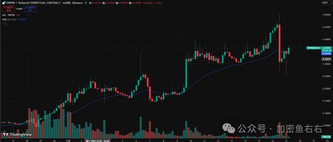 Highly manipulated coins require quick in-and-out trading! Don't get emotionally or morally invested in coins like Beat and Pippin; take a quick profit and run. These guys are there to fleece you. After a pump and dump, they can cut their losses in half at any moment. Take your profits and leave; don't be greedy. Add to your position in batches when the price retraces to the daily MA30 or the lower Bollinger Band on the 4-hour chart, targeting the previous high resistance level. Set a stop-loss of 5-7%. Never chase the price higher; strict risk management is essential.