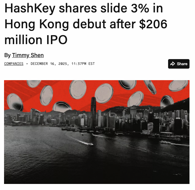 .@HashKeyGroup 's Hong Kong debut gets a mixed reception. Its shares slipped 3% by midday after the crypto exchange raised $206M in its IPO, pricing at HK$6.68 — near the top of the range. Read full story @TheBlock__