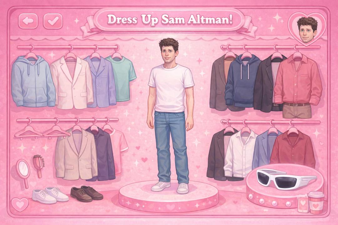 Prompt: Put him in a 2000s dress-up game interface, and make the whole environment pink. Make sure the sunglasses are in the outfit too.