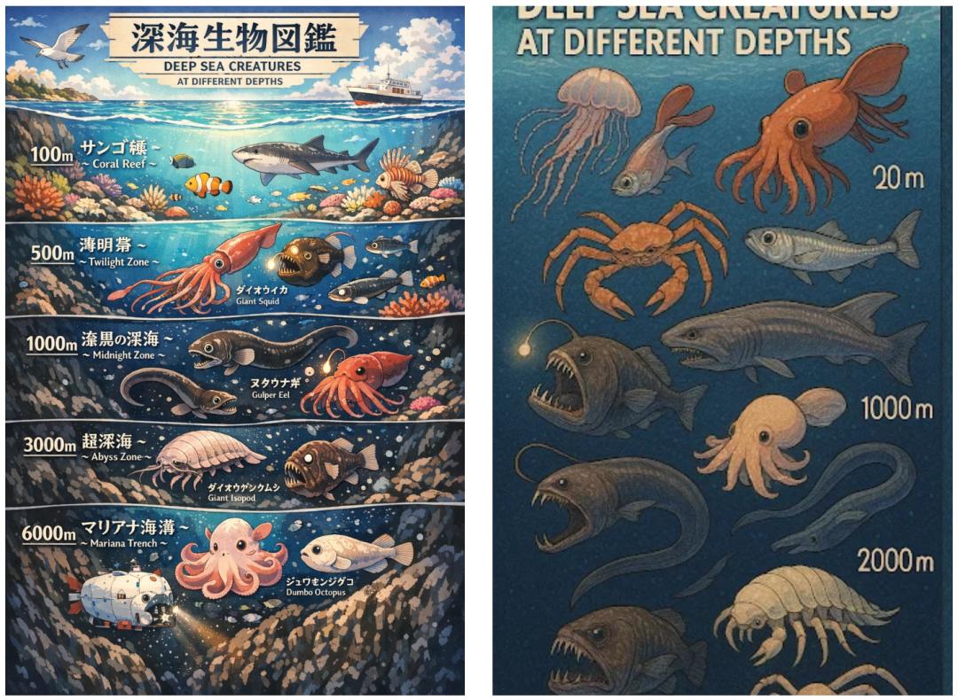 For example, the new (left) version shows cross-sections of marine life at different depths in a Japanese anime style, but the style is clearly not as consistent with the "Japanese anime style" as the old version (right).