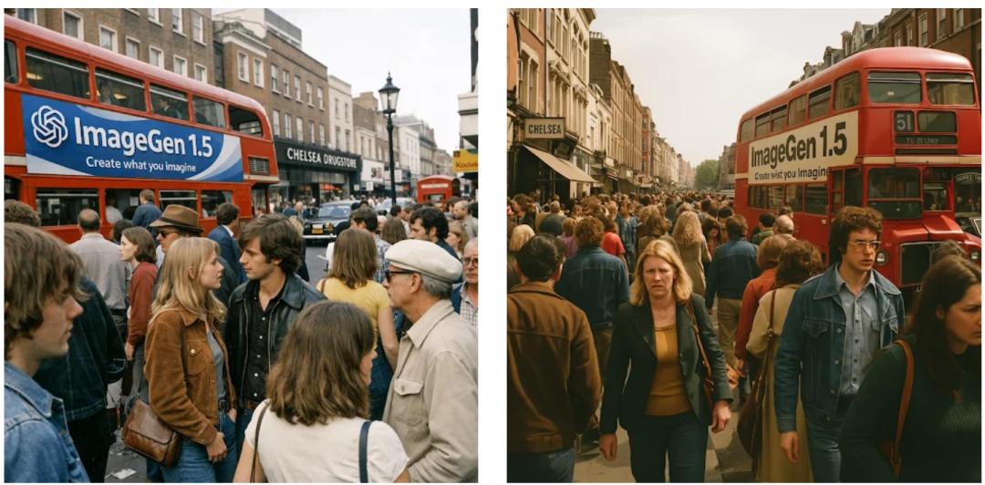 Prompt: Create a street scene of Chelsea, London in the 1970s, with photorealistic, full-focus, and incredibly detailed imagery. The street should be packed with people, and there should be a bus with an advertisement for "ImageGen 1.5," along with the OpenAI logo and subtitle "Create what you imagine." The overall style should be hyper-realistic amateur photography, like a snapshot taken with an iPhone…