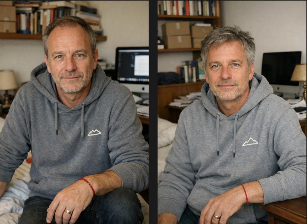 The caption reads: "A 53-year-old white German man in a bedroom, a typical Italian-style bedroom, with boxes and books piled on shelves, a desk in the background with an iMac and papers scattered around, wearing a gray hoodie (with a simple logo), a wedding ring, and a subtle red bracelet on his wrist, looking directly at the camera in a natural, candid user-generated content style."