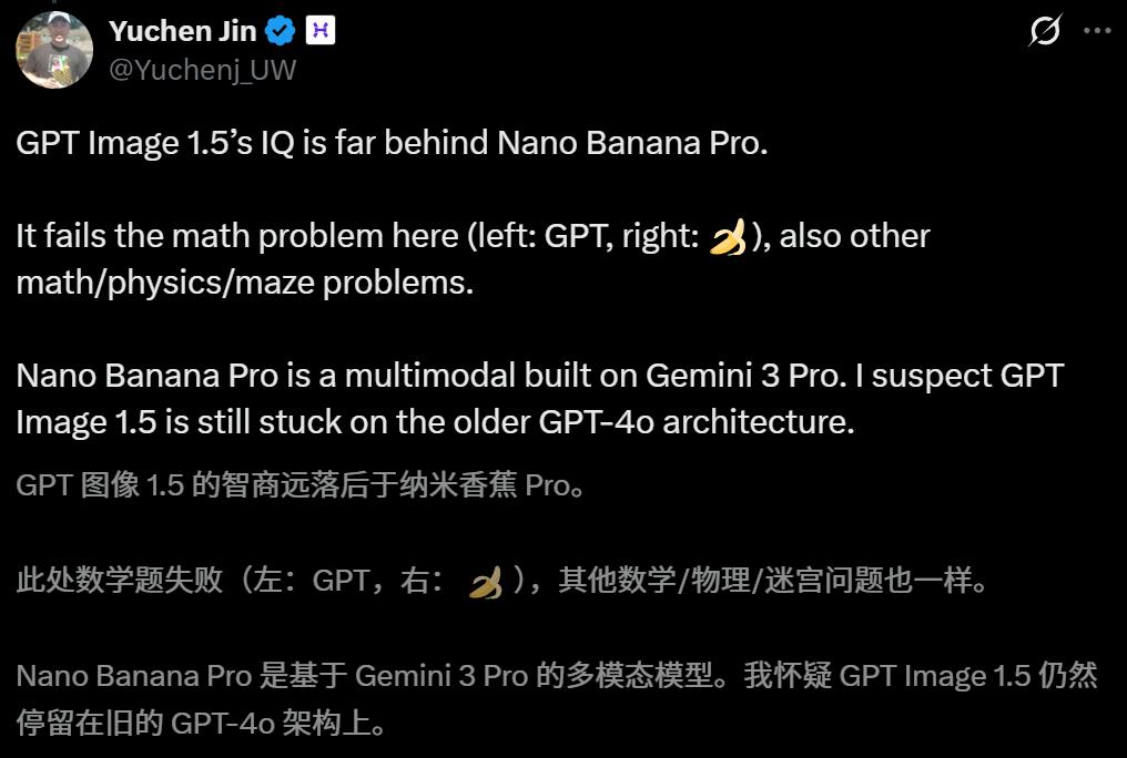 In Yuchen Jin's comparison, GPT's raw image processing capabilities are basically on par with Google NBP, but its intelligence is utterly crushed.