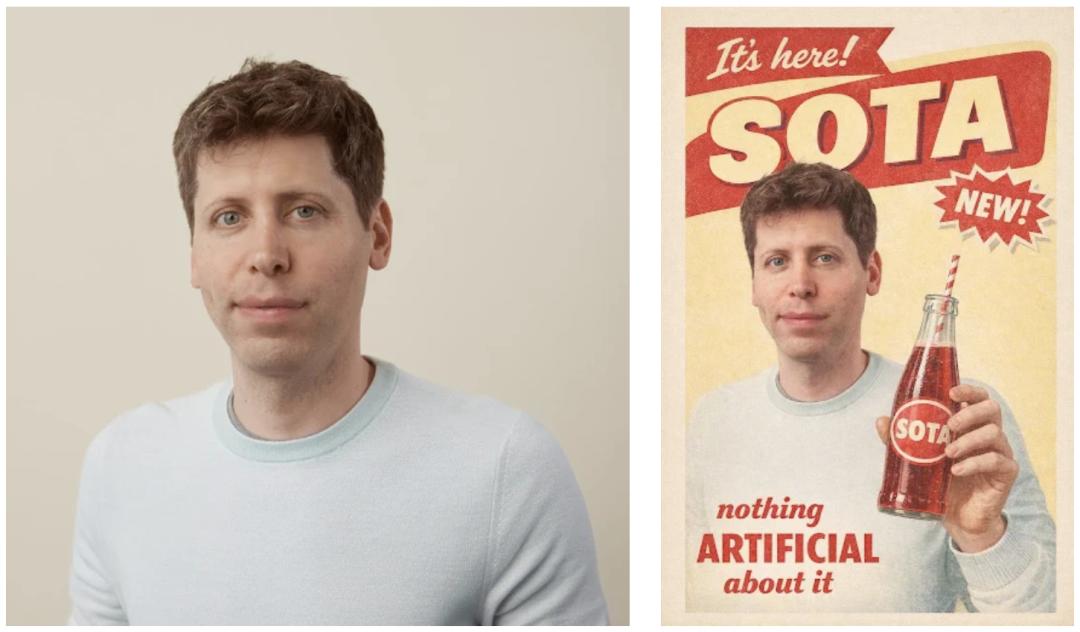 Prompt: Use the face of the man in the attachment to create a retro soda ad for a new beverage called "SOTA" (a new type of soda). The slogan should be: "Nothing artificial about it." The style should faithfully recreate that era.