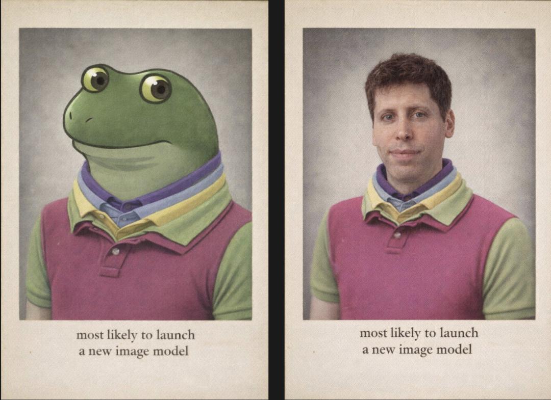 The image of Sad Frog or Pepe the Frog (left) closely resembles OpenAI's teaser image (right) – the same background, the same text, the same gaze, and similar clothing.