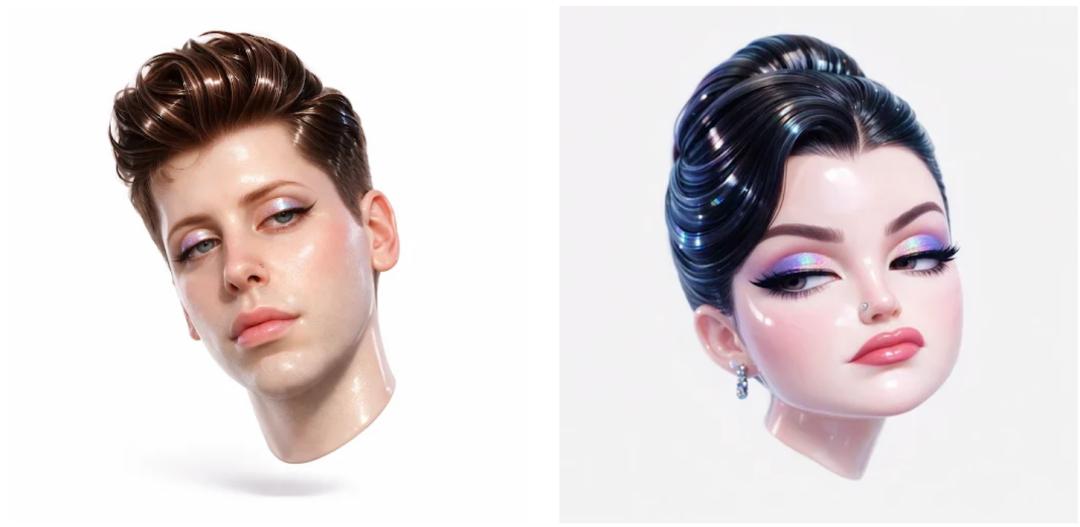Prompt: Create a highly stylized 3D floating head, portraying the protagonist as spoiled, charming, and utterly indifferent: half-closed eyes, raised eyebrows, and a slight upturn at the corners of the mouth, exuding the classic "sassy babe" vibe. The skin should have a smooth, glossy, gel-like texture, with strong highlights on the cheekbones and nose, capturing soft studio lighting. The eyeshadow should be holographically polarized, grading from purple to blue with clear reflective points. The hair should be thick, smooth, and glossy, styled into sculpted waves or a sleek updo, reflecting light like polished acrylic. Add a small chrome nose ring (stud or ring) with a brushed metallic sheen. The head should float on a pure white, neutral background, tilted at a 15-degree angle, like a high-end product rendering. Use bright, diffused studio lighting, avoiding hard shadows, emphasizing gloss, a plastic-like feel, and subsurface scattering, achieving realistic depth. The emotion should be spoiled, fashionable, and detachedly cool. The camera position should be a close-up portrait, looking directly at the lens, with an 85mm focal length. The material should be ultra-smooth, high-gloss, cartoonish-style plastic-like skin, lips, and hair.