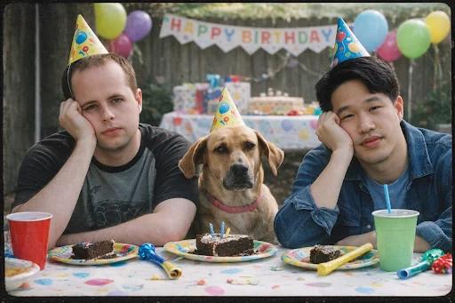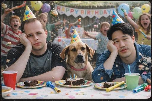 With just the two people and their dog, GPT Image 1.5 accurately captured the boredom they felt while being forced to "work" at their birthday party.